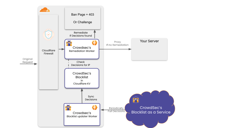 crowdsec-cloudflare-worker-bouncer(Remediation Worker) - applies cached decisions to incoming requests (same as daemon mode)decisions-sync-worker(Blocklist updater Worker) - periodically fetches and caches security decisions using Cloudflare scheduled tasks